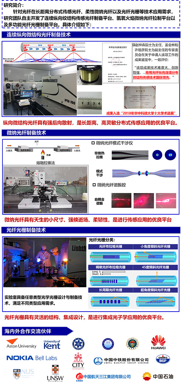 特種光纖與智能感知技術(shù)研究所是華中科技大學(xué)無錫研究院的二級研究單位,研究所依托武漢光電國家研究中心和華中科技大學(xué)光學(xué)與電子信息學(xué)院等國家級科研平臺,聚集了一批特種光纖制備及傳感應(yīng)用研究領(lǐng)域的專家學(xué)者。