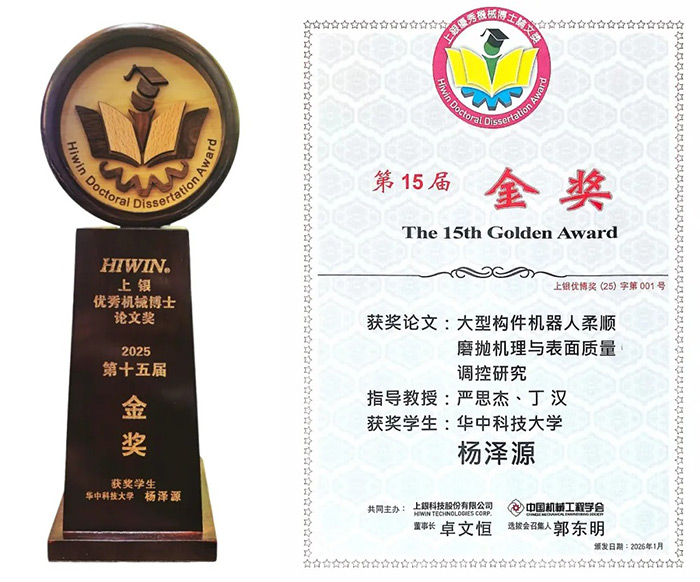 日前,由丁漢院士、嚴思杰教授指導,華中科技大學與集萃數(shù)字制造裝備與技術研究所聯(lián)合培養(yǎng)的博士楊澤源,斬獲第15屆“上銀優(yōu)秀機械博士論文獎”金獎。